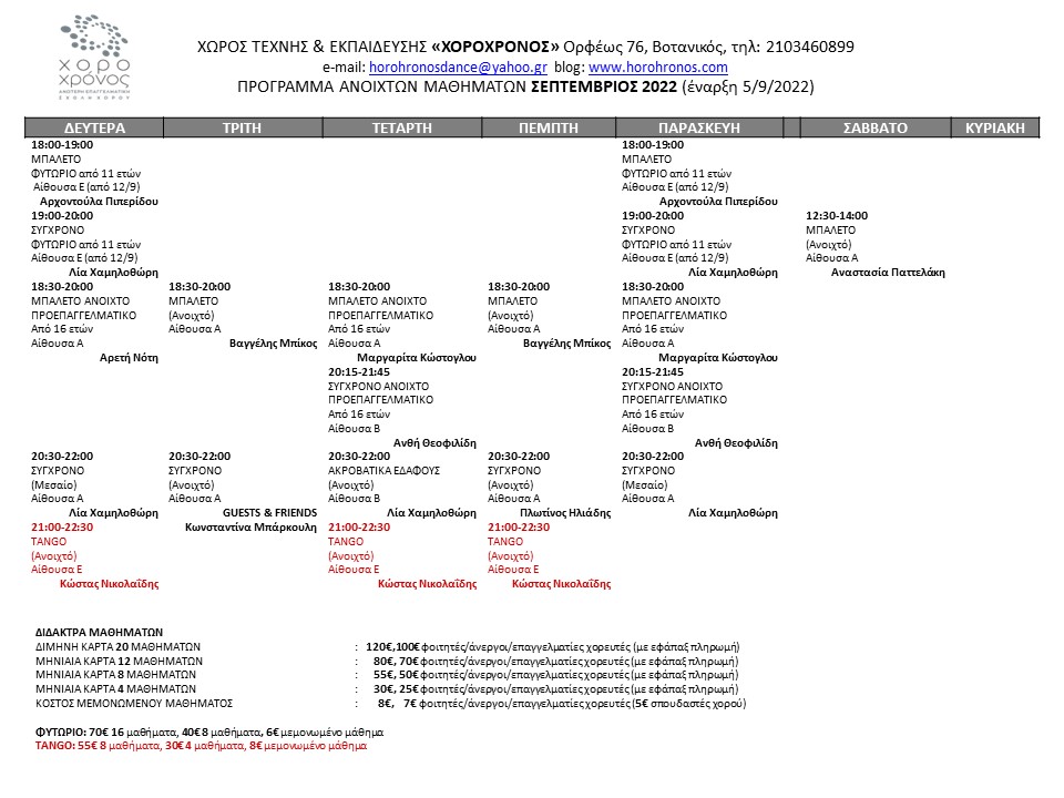 Πρόγραμμα ανοιχτών απογευματινών μαθημάτων Σεπτέμβριος 2022 (έναρξη 5/9)