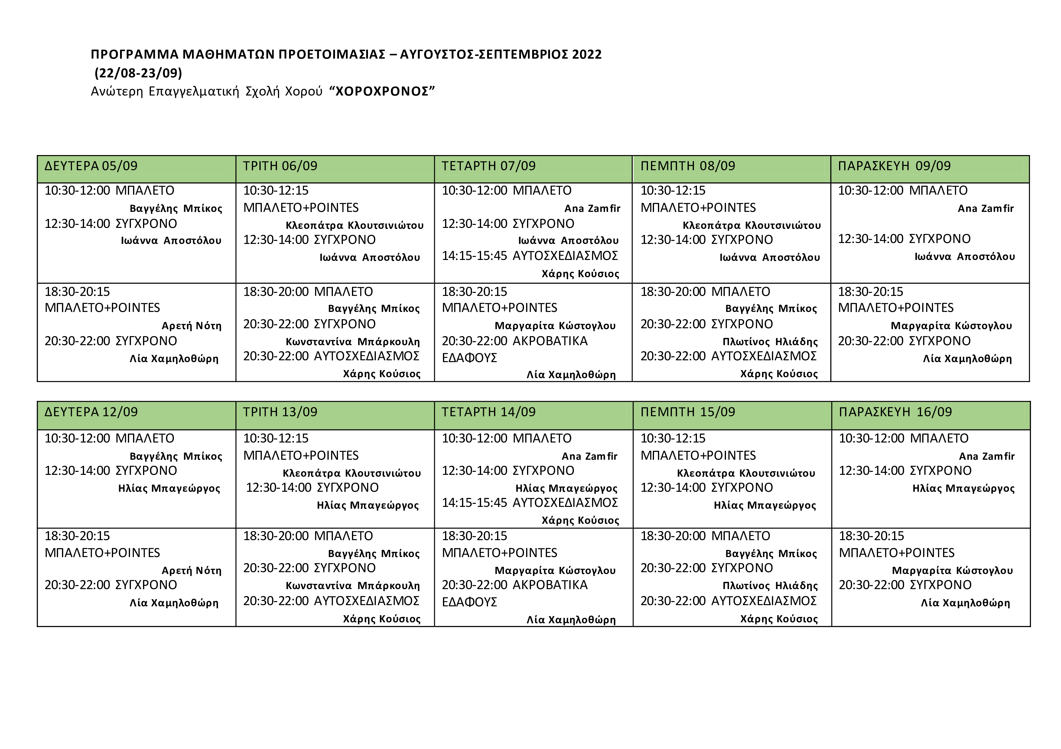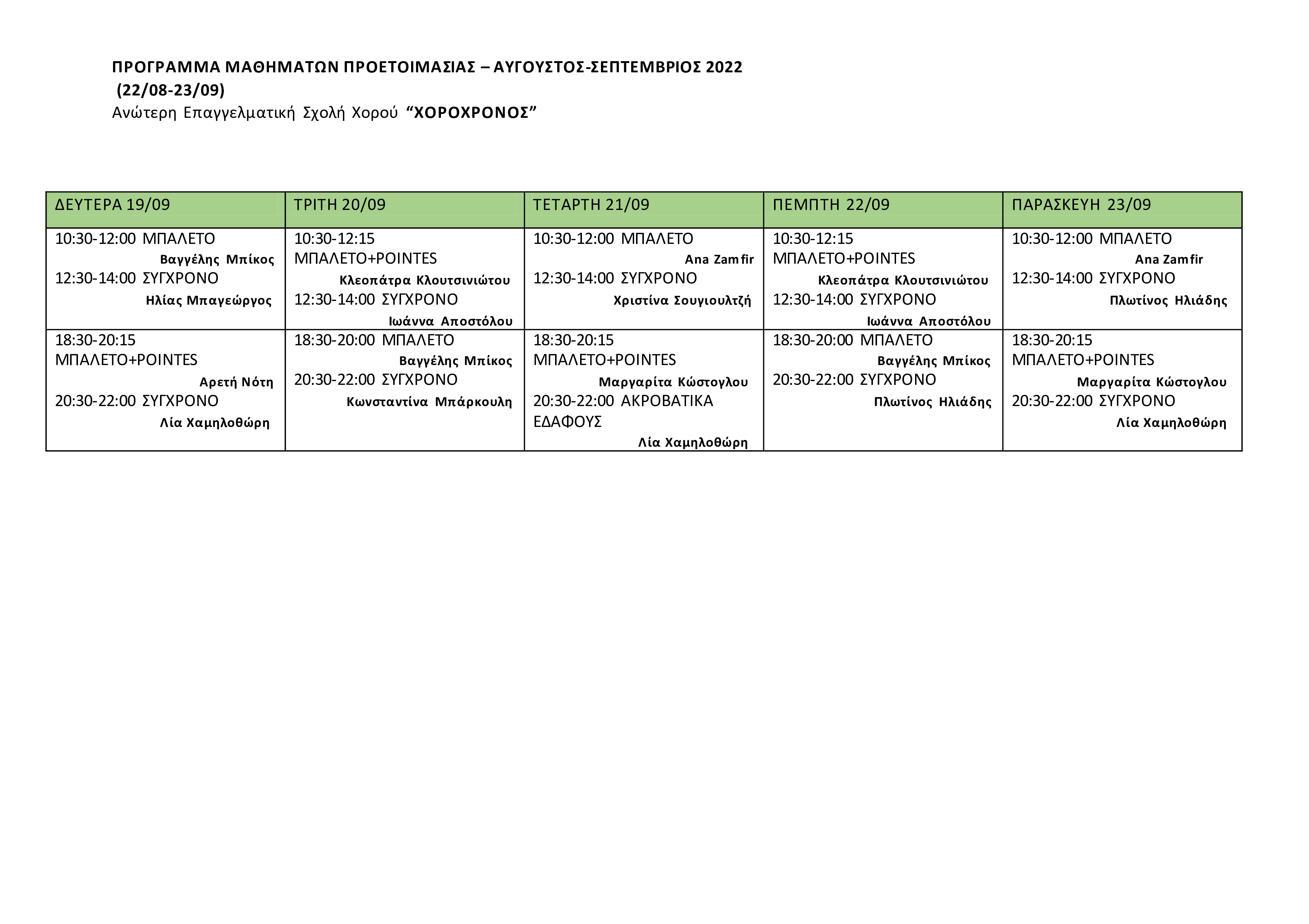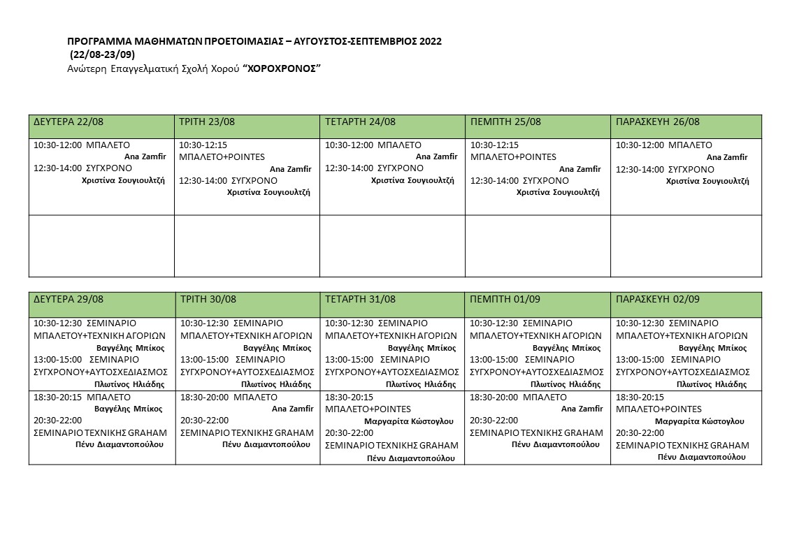 Πρόγραμμα μαθημάτων προετοιμασίας Αύγουστος-Σεπτέμβριος 2022