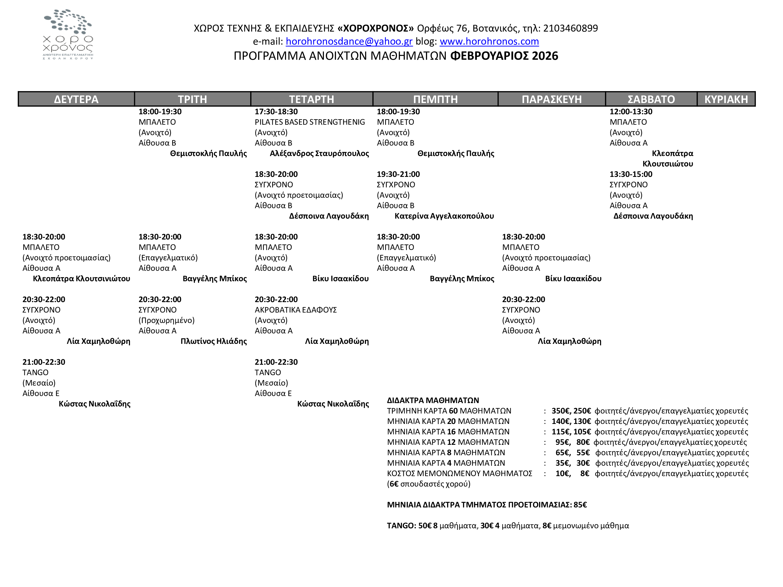ΦΕΒΡΟΥΑΡΙΟΣ 2026 ΧΟΡΟΧΡΟΝΟΣ ΠΡΟΓΡΑΜΜΑ ΑΝΟΙΧΤΩΝ ΑΠΟΓΕΥΜΑΤΙΝΩΝ ΜΑΘΗΜΑΤΩΝ