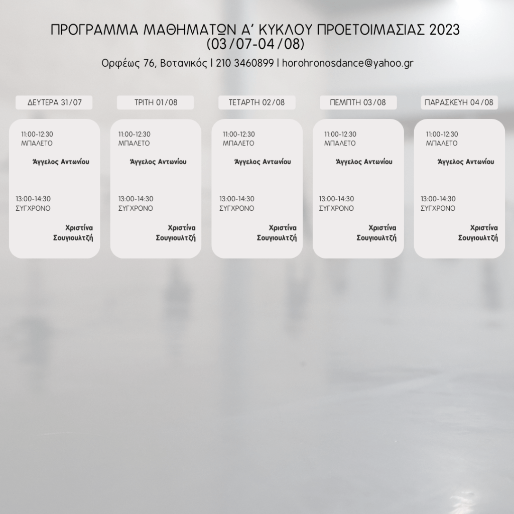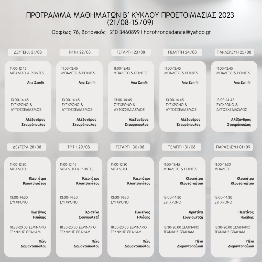 Η Καλοκαιρινή προετοιμασία του ΧοροΧρόνου ξεκινάει 03 Ιουλίου και ολοκληρώνεται 15 Σεπτεμβρίου. Αποτελείται από 2 κύκλους μαθημάτων: