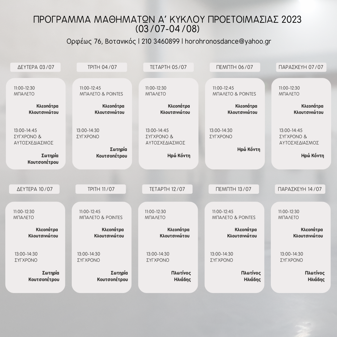 Η Καλοκαιρινή προετοιμασία του ΧοροΧρόνου ξεκινάει 03 Ιουλίου και ολοκληρώνεται 15 Σεπτεμβρίου. Αποτελείται από 2 κύκλους μαθημάτων: