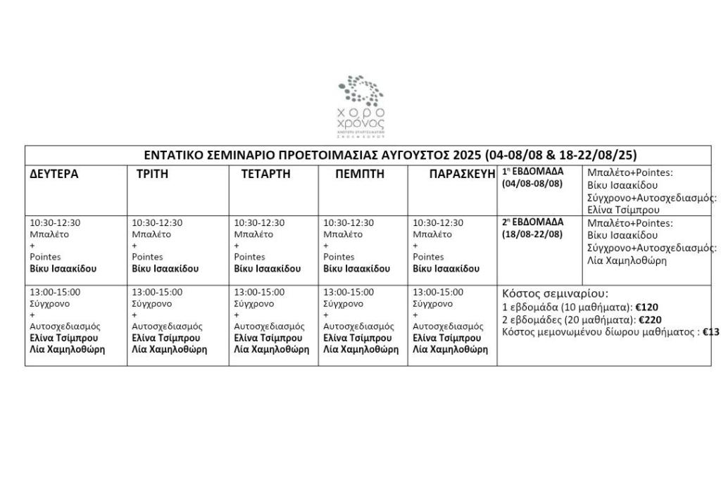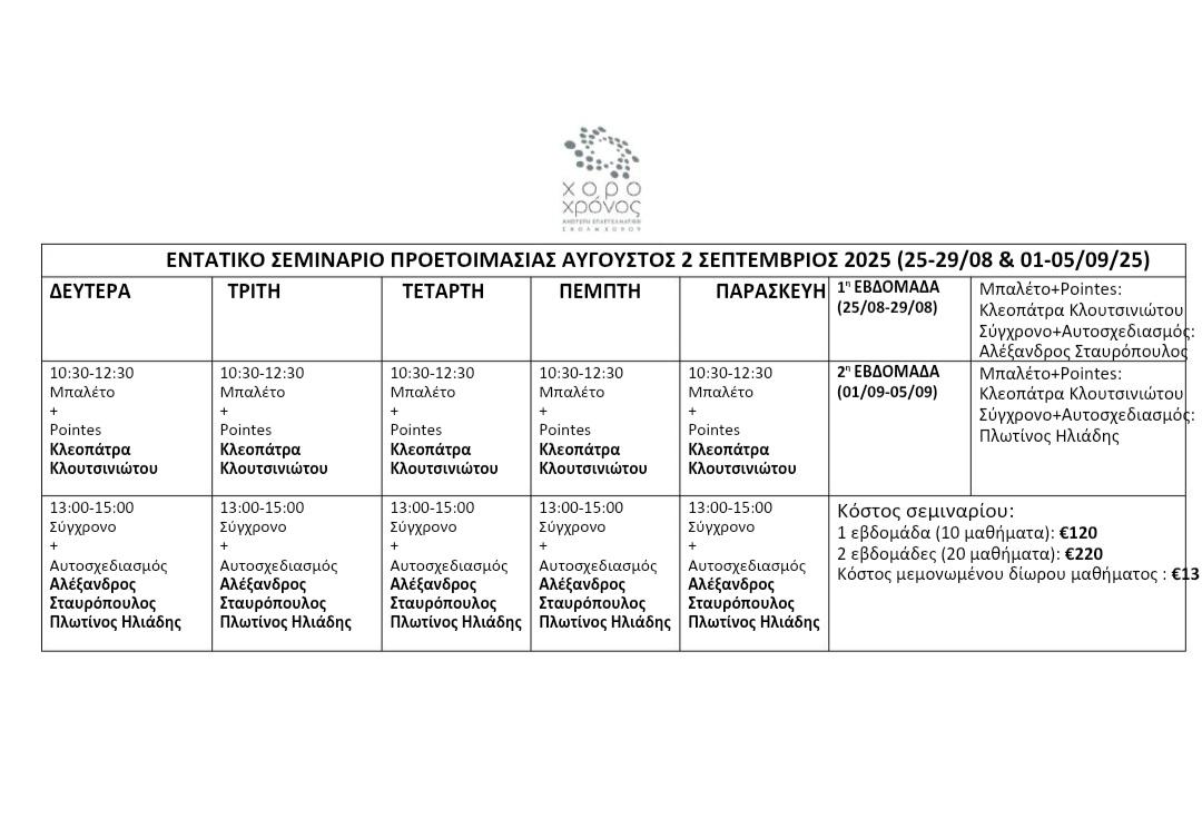 ΠΡΟΓΡΑΜΜΑ ΠΡΩΙΝΩΝ ΕΝΤΑΤΙΚΩΝ ΣΕΜΙΝΑΡΙΩΝ ΠΡΟΕΤΟΙΜΑΣΙΑΣ ΓΙΑ ΕΙΣΑΓΩΓΙΚΕΣ ΕΞΕΤΑΣΕΙΣ ΣΕ ΑΝΩΤΕΡΕΣ ΣΧΟΛΕΣ ΧΟΡΟΥ Β’ ΚΥΚΛΟΣ ΑΥΓΟΥΣΤΟΣ ΣΕΠΤΕΜΒΡΙΟΣ 2025 Απαραίτητη η κράτηση θέσης: horohronosdance@yahoo.gr Συνολικό κόστος Β’ κύκλου 4 εβδομάδων: €420 Early bird μέχρι 31/05 €330
